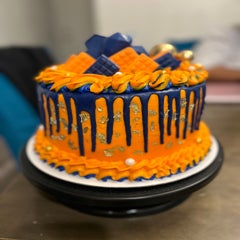 *Decorated with our own banana flavored buttercream in orange and white, chocolate and gold wafers/hearts, gold and white edible pearls, and peach drip around the edges on the back of the cake.