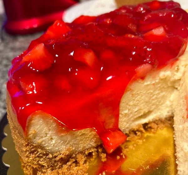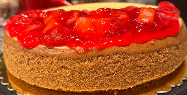 Rich and creamy cheesecake topped with strawberry topping and graham cracker crust.