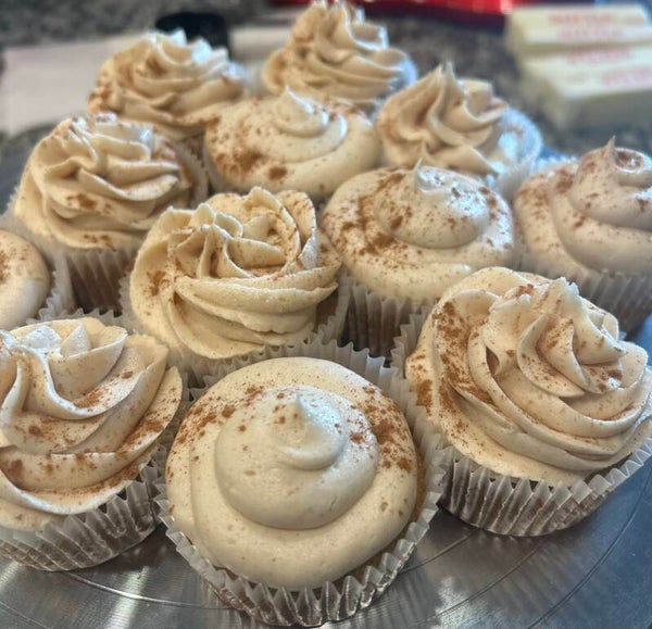 Moist cupcakes infused with fresh bananas and cinnamon and topped with cinnamon buttercream.